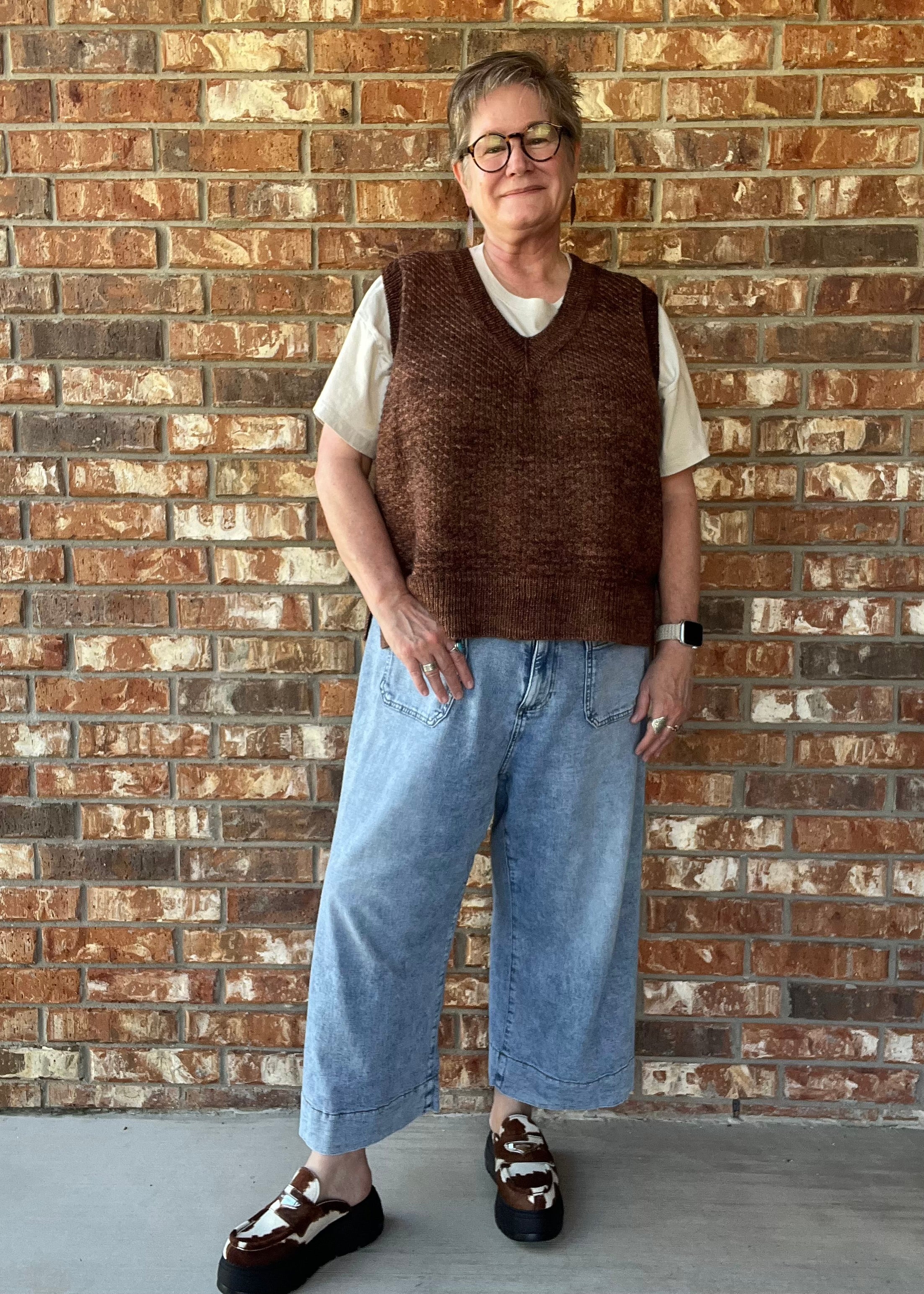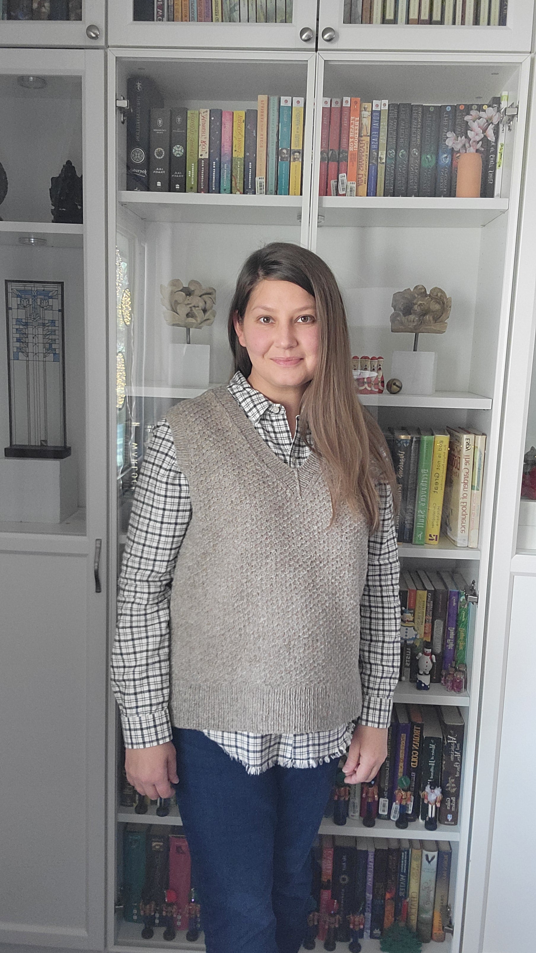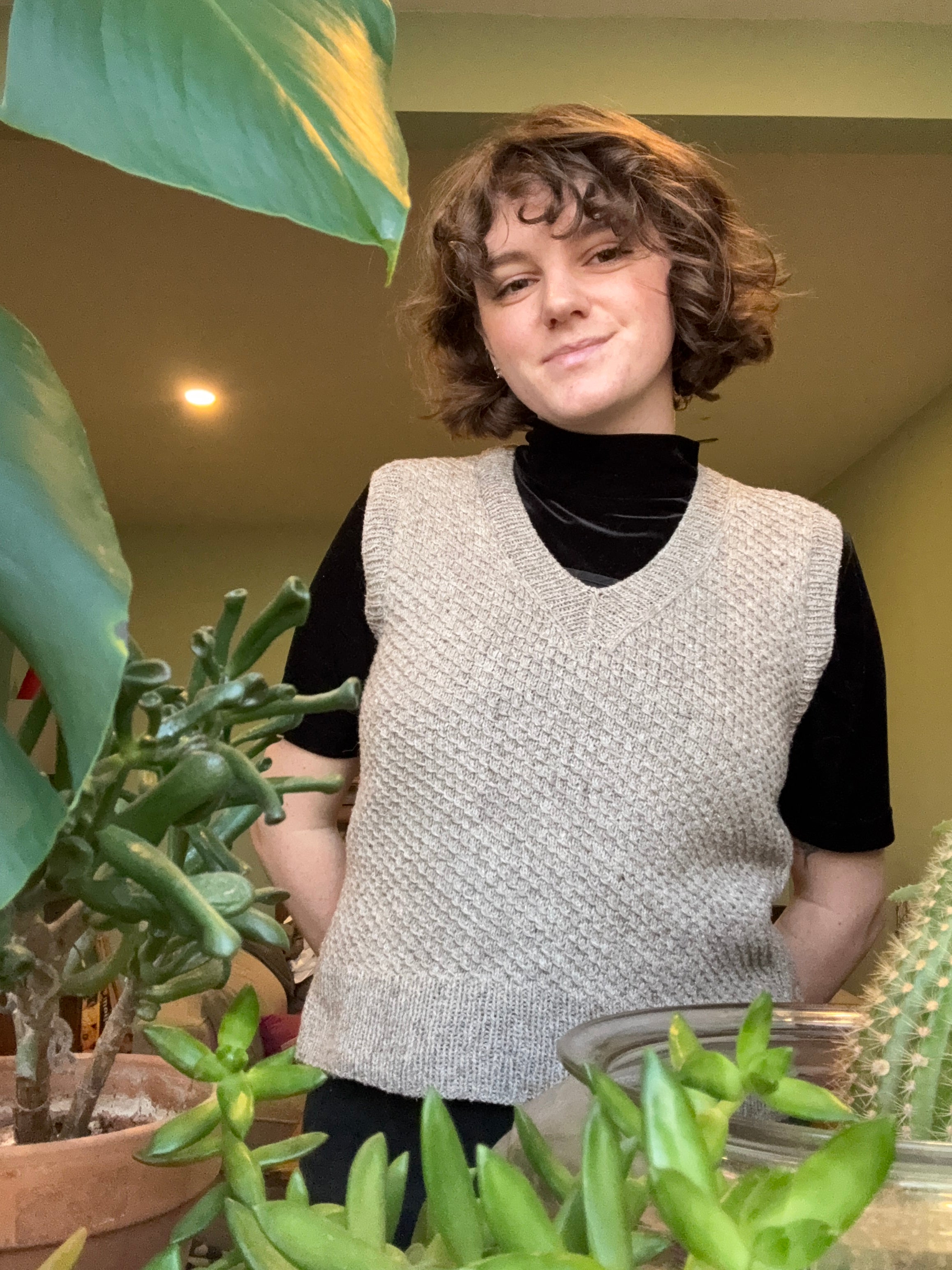 The Reading Room Slipover is a classic textured vest with a large range of options to make it your own. Choose between V-neck or a crew neck, between a high hip length or a cropped length, and add an optional high-low hem if you want it.